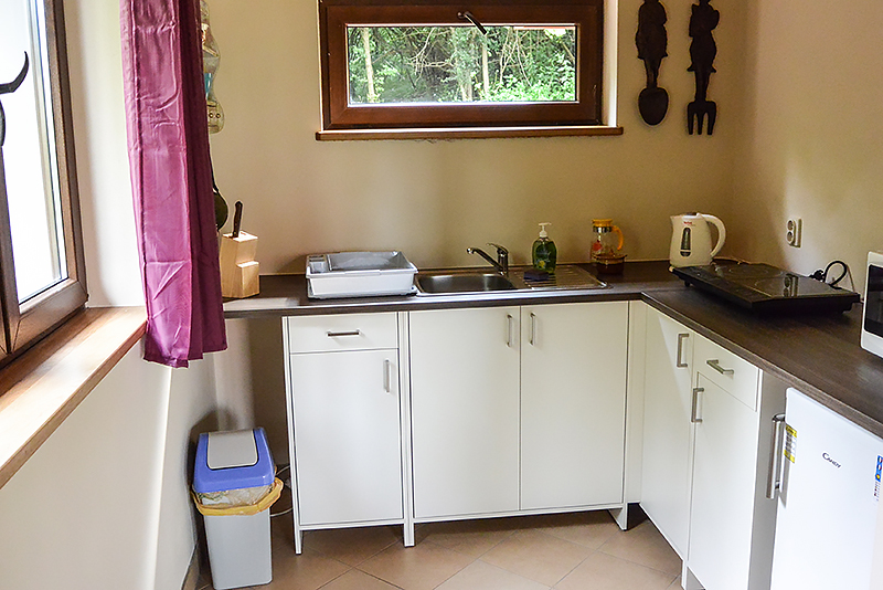 - Kuchnia z lodówką, płytą grzewczą i kuchenką mikrofalową, wyposażona w potrzebne naczynia, sztućce, garnki oraz czajnik elektryczny
