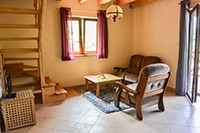 Nowy dom z drewnianym poddaszem o powierzchni 50m2 może wygodnie ugościć 4-5 osób. Na parterze salon z kuchnią oraz wyjściem na zadaszony bardzo słoneczny taras. Łazienka z WC i prysznicem. Na poddaszu dwie sypialnie: Widokowa z wyjściem na taras i łóżkiem małżeńskim oraz Leśna, do której zaglądają gałęzie drzew.